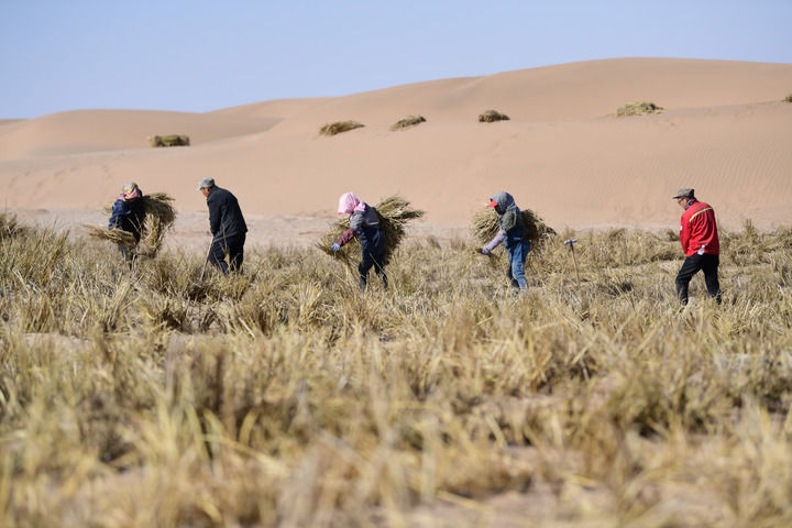 2025年2月28日,在巴丹吉林和腾格里两大沙漠交汇处的阿拉善九棵树项目区,治沙工人用稻草在沙漠中扎草方格。新华社发(康文魁摄)