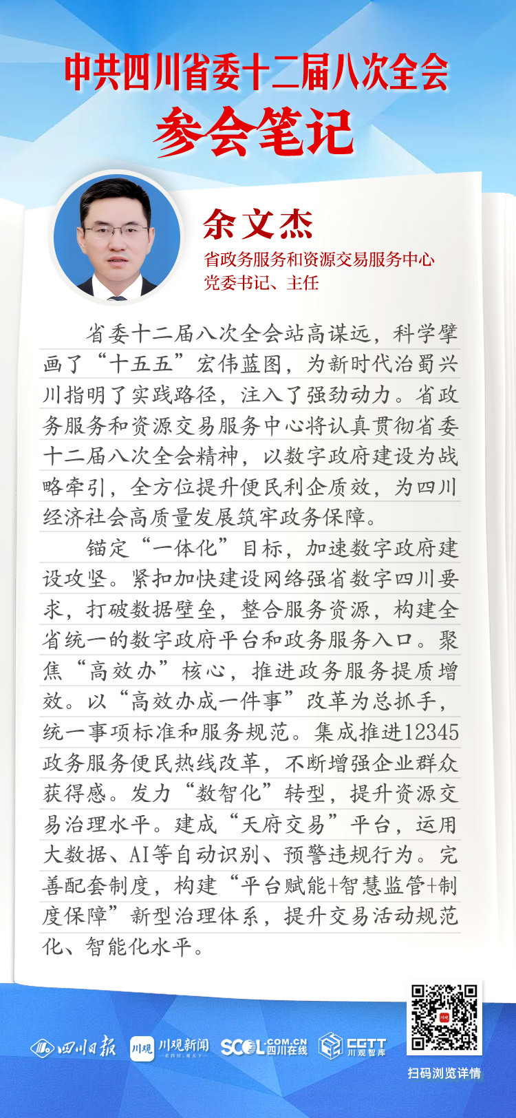 省委十二届八次全会站高谋远,科学擘画了“十五五”宏伟蓝图,为新时代治蜀兴川指明了实践路径,注入了强劲动力。省政务服务和资源交易服务中心将认真贯彻省委十二届八次全会精神,以数字政府建设为战略牵引,全方位提升便民利企质效,为四川经济社会高质量发展筑牢政务保障。