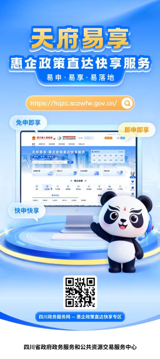 12月1日,由四川省政府政务服务和公共资源交易服务中心(以下简称省政务服务和资源交易服务中心)全新打造的“天府易享·惠企政策直达快享服务专区”(以下简称“天府易享”专区)正式上线试运行。作为省级惠企政策服务的统一入口,该专区持续优化惠企政策制定、发布、受理、审核、兑现等全流程服务,推进资金扶持、税费减免等惠企政策精准推送和相关服务事项一站式办理。